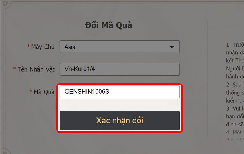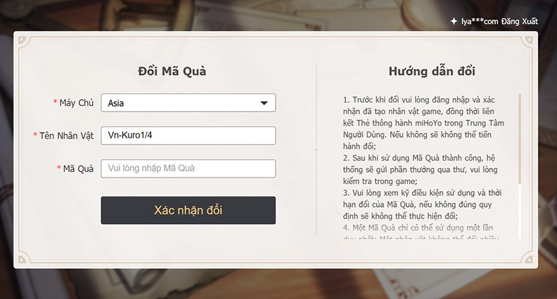 - Truy cập trang: https://genshin.hoyoverse.com/en/gift