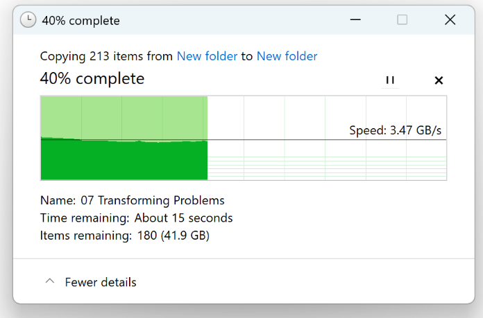 Ở các bài test thực tế như sao chép file lớn, tốc độ duy trì ổn định quanh mức 3.5 – 4.5 GB/s, cho thấy vai trò quan trọng của bộ đệm DRAM trong việc giữ vững hiệu năng suốt phiên tải nặng.