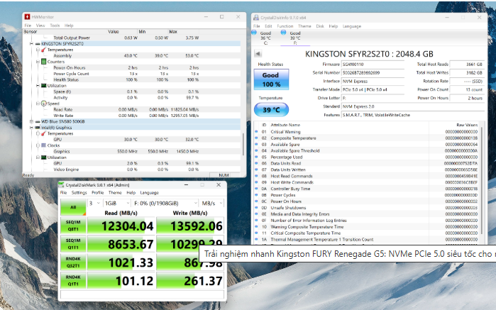 Khi thử nghiệm bằng công cụ CrystalDiskMark 9.0.1 trên cấu hình Intel Core Ultra 9 + ASUS Z890, Kingston FURY Renegade G5 đạt tốc độ gần 13.600 MB/s ghi và 12.300 MB/s đọc, tiệm cận mức công bố và vượt xa chuẩn Gen 4 thông thường.