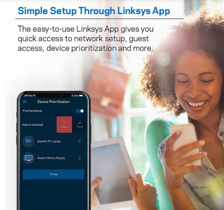 Linksys Velop hỗ trợ người dùng quản lý thông qua ứng dụng được cài đặt trên điện thoại (iOS, Android). Smart Wifi cho phép người dùng điều khiển router từ xa. Nó hỗ trợ các tính năng như quản lý, giới hạn truy cập, thiết lập dễ dàng. Với giao diện trực quan, đơn giản, thao tác dễ ngay từ lần đầu, người dùng hoàn toàn kiểm soát được mạng wifi.