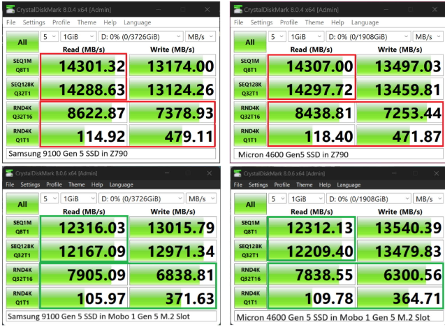 Trang công nghệ The SSD Review là bên đầu tiên phát hiện ra vấn đề. Trong quá trình thử nghiệm SSD PCIe 5.0 Samsung 9100 Pro và Micron 4600 – vốn có thể đạt tốc độ đọc tuần tự lên tới 14GB/s – nhóm nhận thấy: